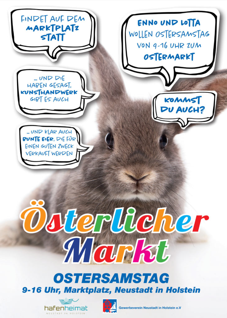 Am Ostersamstag, 04.04. organisiert der Gewerbeverein den „Österlichen Markt“ auf dem Marktplatz mit dem größten Ei Schleswig-Holsteins, echten Osterhäschen zum Streicheln und einer leckeren Marktgastronomie. Das „größte Ei des Nordens“ ist mit Tausenden gefärbten Eiern dekoriert, die bereits ab 9 Uhr für einen guten Zweck verkauft werden. Wieder mit dabei ist der Kaninchenzüchterverein U 107 und der Kleine Kreis vom Neustädter Volkstanzkreis. Hobby-Kunsthanderkerstände bereichern den „Österlichen Markt“ und große Kuschelhasen verteilen Süßes an die Kinder. Der Markt endet um 16 Uhr. Fragen zum Österlichen Markt beantwortet Jürgen Mohr vom Gewerbeverein unter 04561/ 610753.